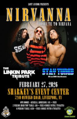 Nirvanna – Tribute to Nirvana live at Sharkeys Event Center in Liverpool!  Support comes from The Linkin Park Tribute and Stay Tuned CNY!